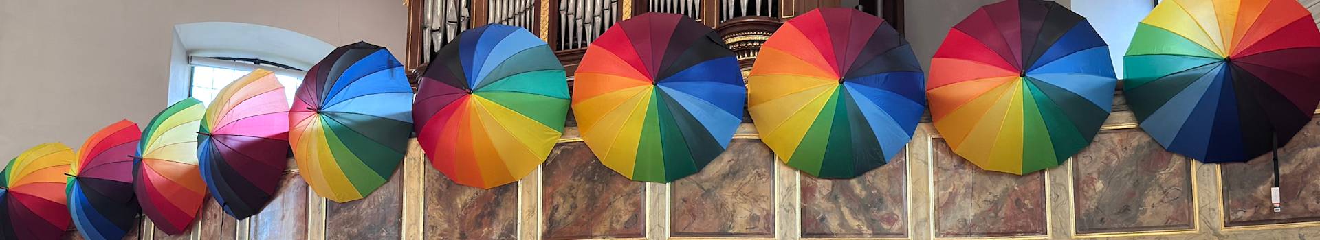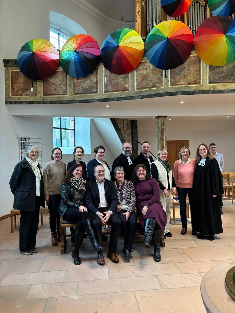 unter Gottes Regenbogen vereint, im Bund mit Gott und in seiner unverdienten Liebe: die alten mit den neuen Kirchengemeinderät*innen zusammen mit ihrem Pfarrehepaar.
